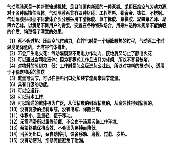 結構材質:鋁合金、鑄鐵、316不銹鋼、耐蝕鎳基合金、聚丙烯,聚偏二氟乙烯、碳充乙縮醛,特氟龍。