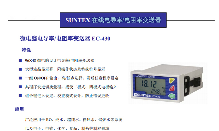 SUNTEX電導率儀EC-430水質監(jiān)測電導率控制儀電阻率變送器