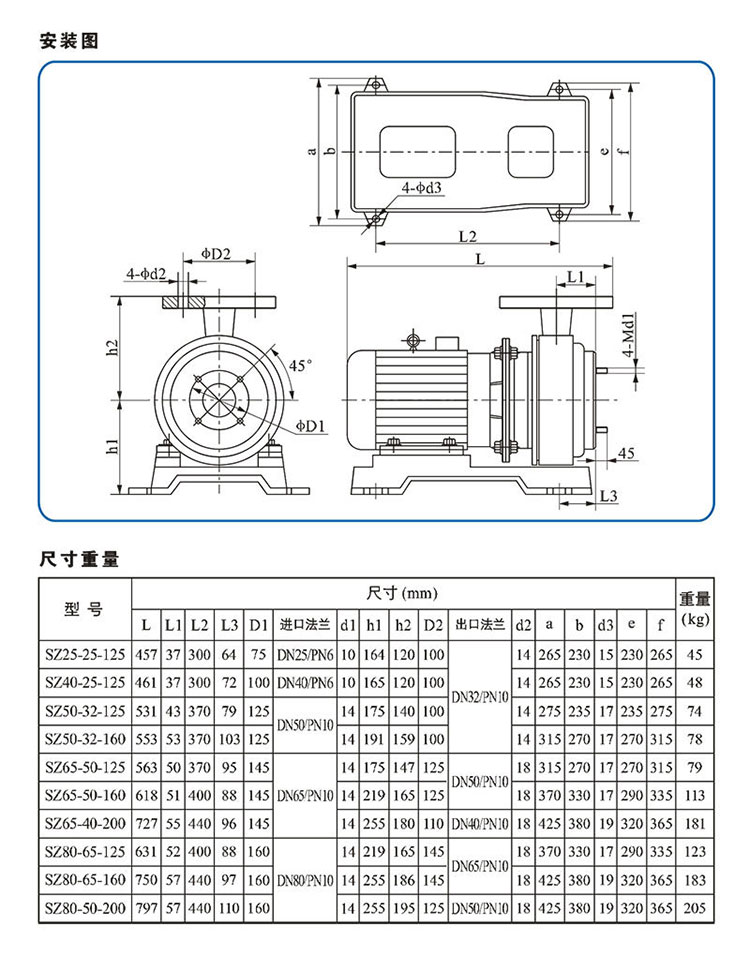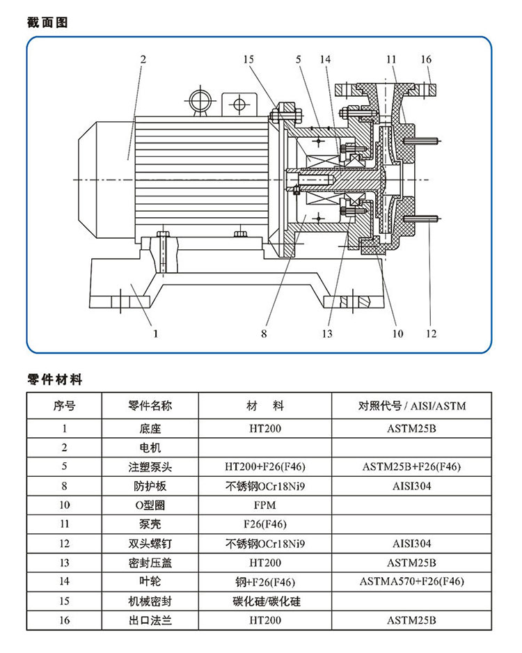 南方SZ單級臥式氟塑料離心泵,配加長軸電機,軸向入口和徑向出口,電機軸與葉輪為直聯式,過流部件均采用氟塑料(F26、F46)。