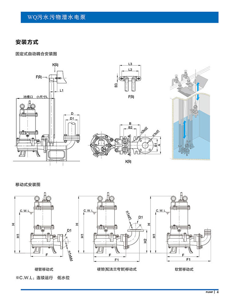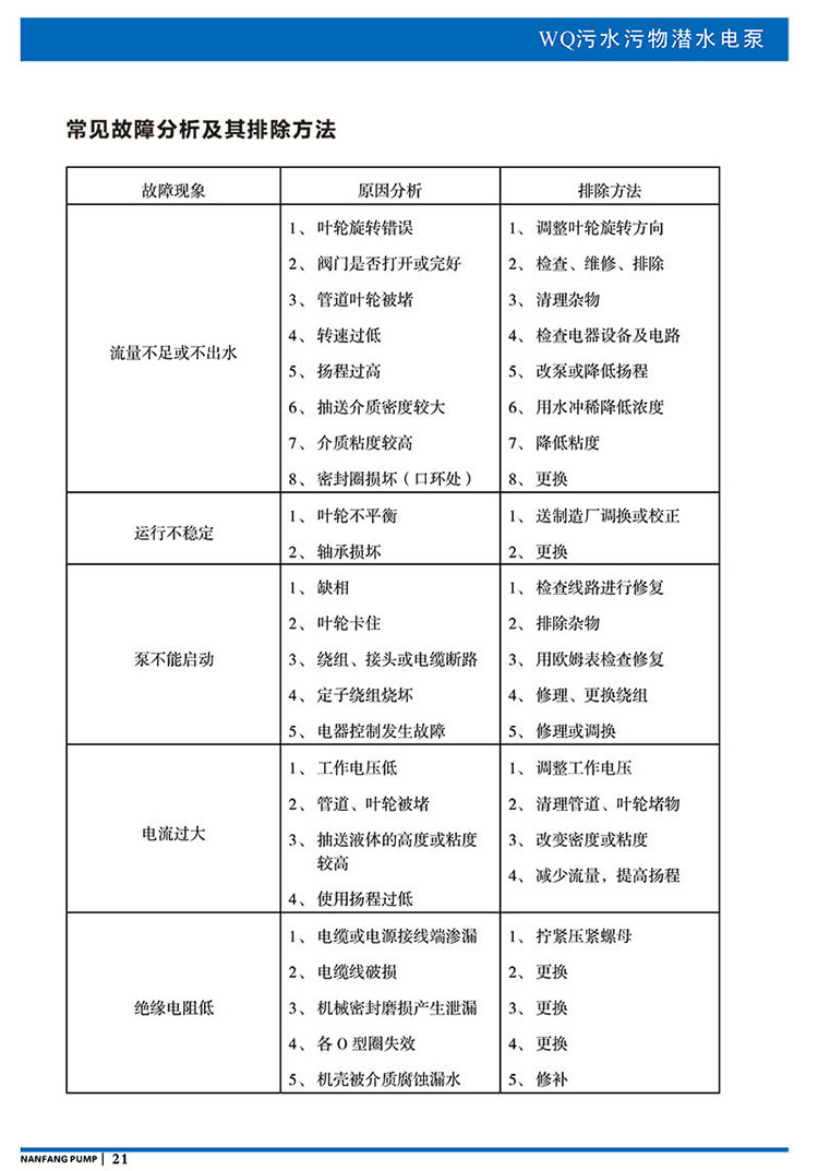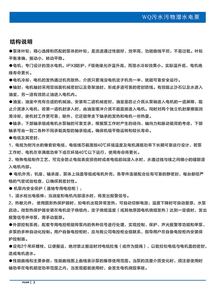 產品說明:南方WQ污水污物潛水電泵由電機與泵兩部分組成,兩者通過油室及機械密封組件隔開,分固定式自動耦合安裝和移動安裝。