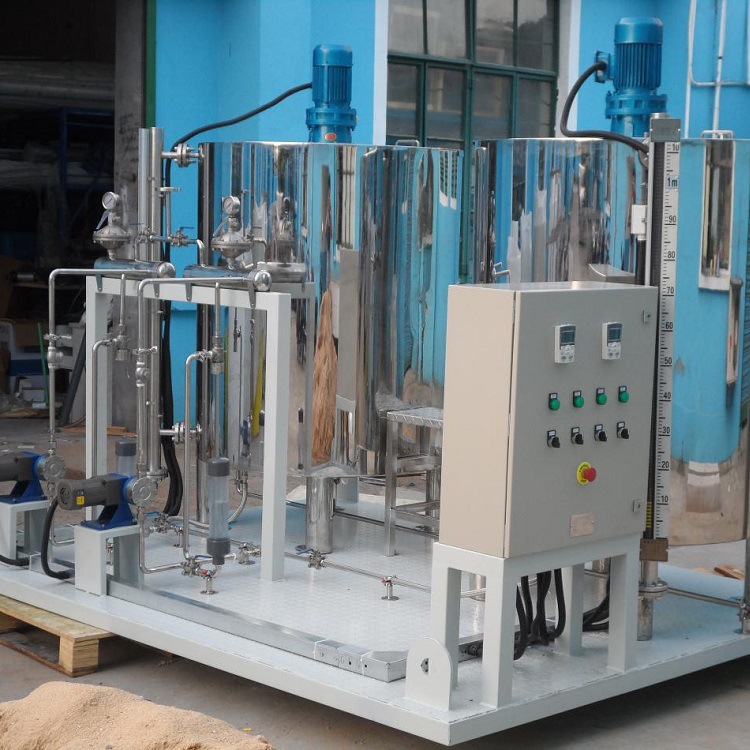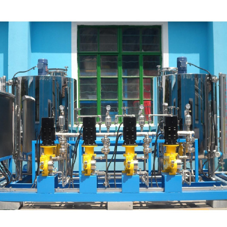 2、加藥裝置組成結構有:溶液箱、液位計、計量箱、攪拌器、加藥計量泵、安全閥、壓力表、控制柜、閥門以及管路集中布置,各部件的材質主要分不銹鋼和碳鋼襯膠。