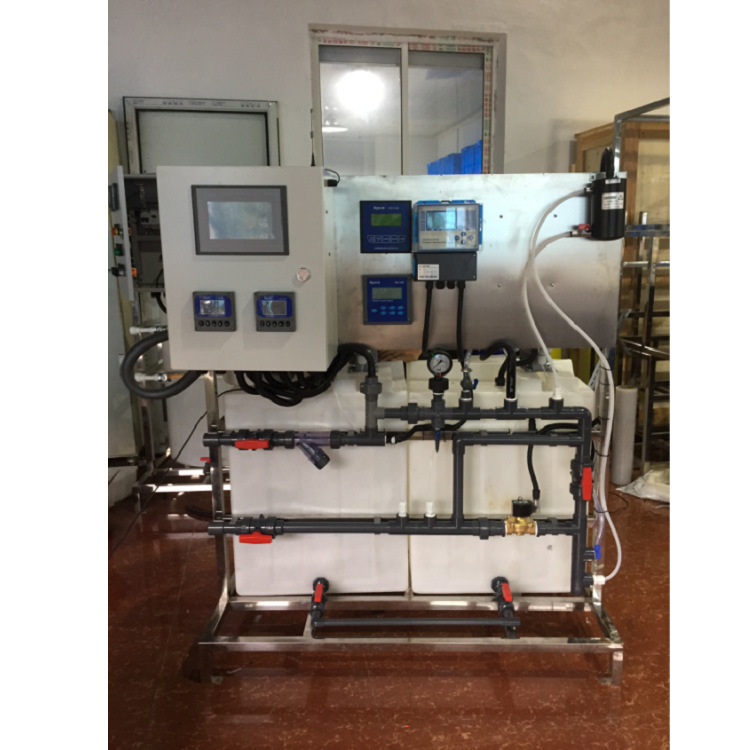 示蹤劑加藥裝置由示蹤劑儀表、PH儀表、0RP儀表、電導(dǎo)率儀表、控制系統(tǒng)、無(wú)線遠(yuǎn)傳系統(tǒng)等部分組成。其工作原理是由示蹤劑儀表檢測(cè)循環(huán)水系統(tǒng)中藥劑的濃度,進(jìn)行PID運(yùn)算,然后自控制系統(tǒng)啟動(dòng)或關(guān)閉加藥泵往循環(huán)水系統(tǒng)添加藥劑。其功能是使藥劑穩(wěn)定在一定的濃度范圍,達(dá)到保護(hù)管道不會(huì)結(jié)垢或腐蝕的趨勢(shì)。循環(huán)水系統(tǒng)進(jìn)行排污或補(bǔ)水時(shí),只要藥劑濃度滿(mǎn)足設(shè)定值,加藥泵依然不向系統(tǒng)中投加藥劑。從而節(jié)約客戶(hù)使用藥劑的成本。