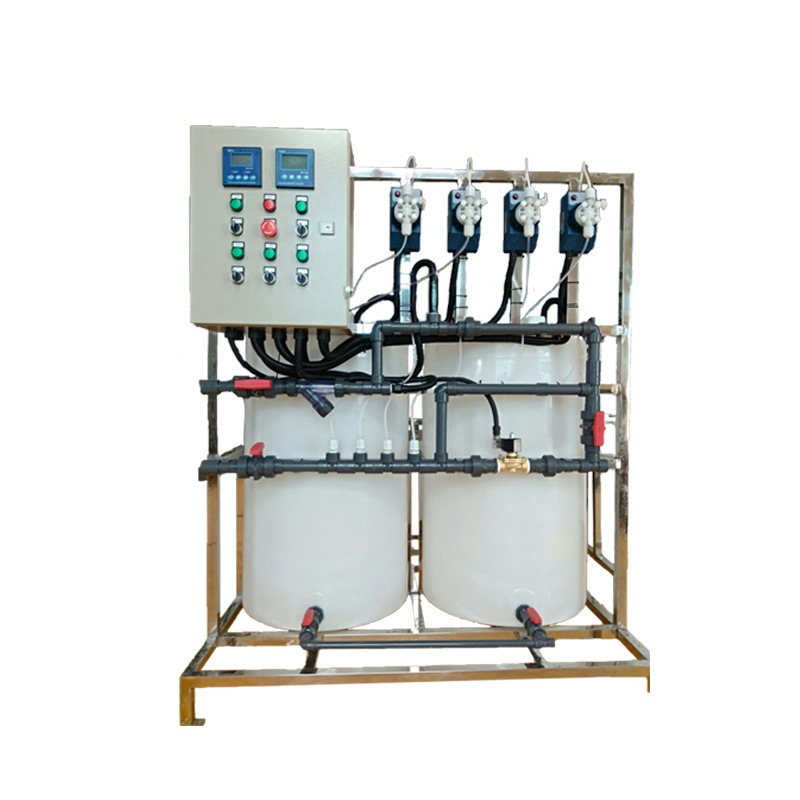 成套加藥裝置和專項成套加藥裝置有多種規格型號,產品包含一罐一泵,一罐兩泵,兩罐兩泵,兩罐三泵,三罐三泵及多罐多泵。系統所使用的配置是根據計量泵的數量和出口來定的,用戶可以根據工藝需要進行選擇,也可依據用戶的特殊需要來設計和生產的非定型產品。
