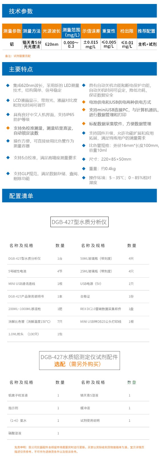 上海雷磁DGB-427便攜式水質(zhì)測定儀免校準測量水質(zhì)分析儀 鋁測試儀