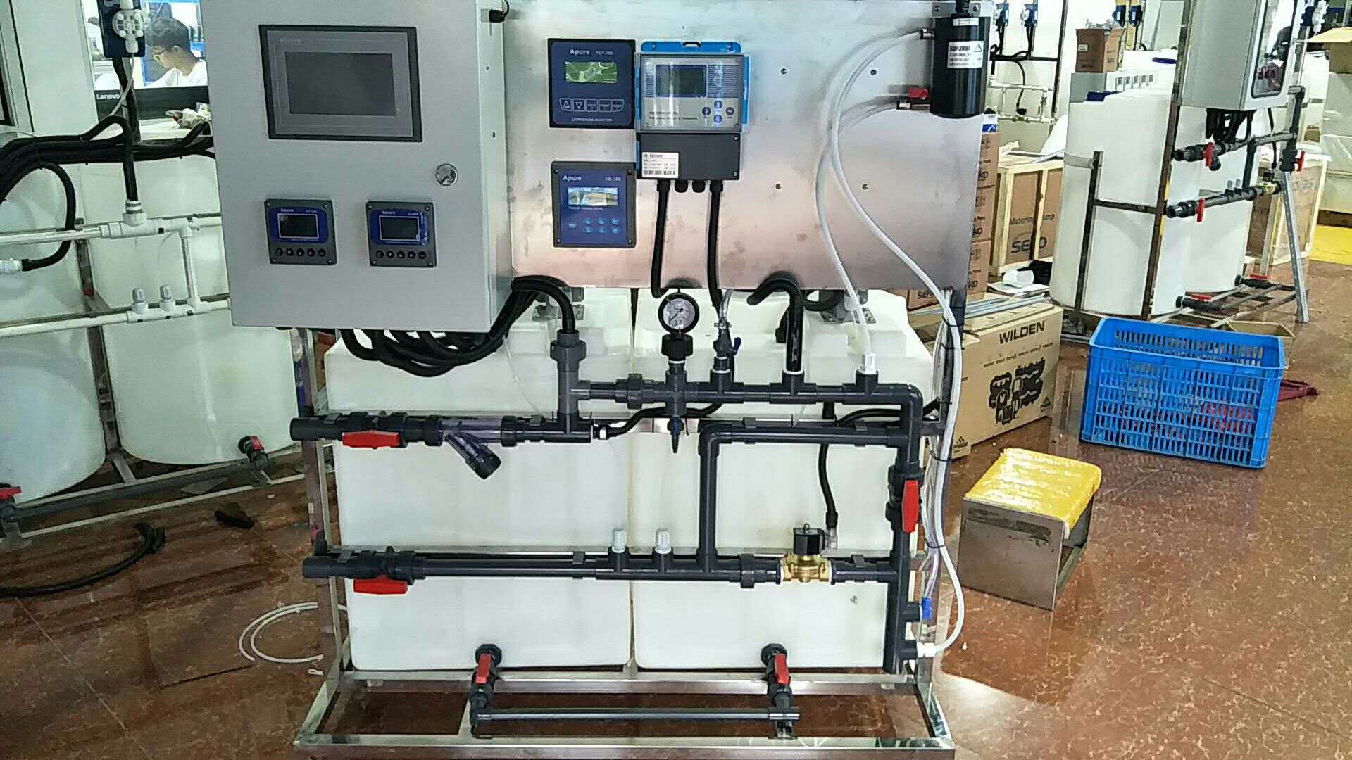 描述:該加藥裝置由主要用于造紙行業(yè)投加各種膠劑。為了保證系統(tǒng)24小時正常運行,該裝置使用一用一備的組合形式,為了管道使用壽命更長,所以管道均采用SS304材質及氬氟焊焊接技術。因造紙行業(yè)各階段的工藝不同,控制需要了解設備的運行狀態(tài)以及當前流量,從而更的投加藥劑。