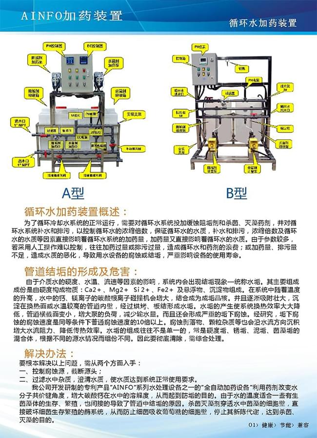 要根本解決以上問題,需從兩個方面入手:一、控制腐蝕源,截斷源頭;二、過濾水中雜質,澄清水質,使水質達到系統正常使用要求。AINFO系列水處理設備之一的“全自動加藥設備”利用藥劑改變水分子共價鍵角度,增大碳酸鈣在水中的溶解度,從而起到防垢的目的。