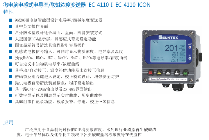 SUNTEX 微電腦電感式電導率/酸堿濃度變送器EC-4110-I  EC-4110-ICON